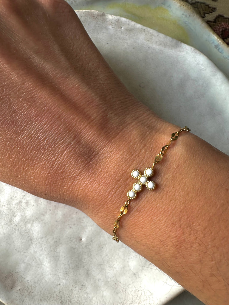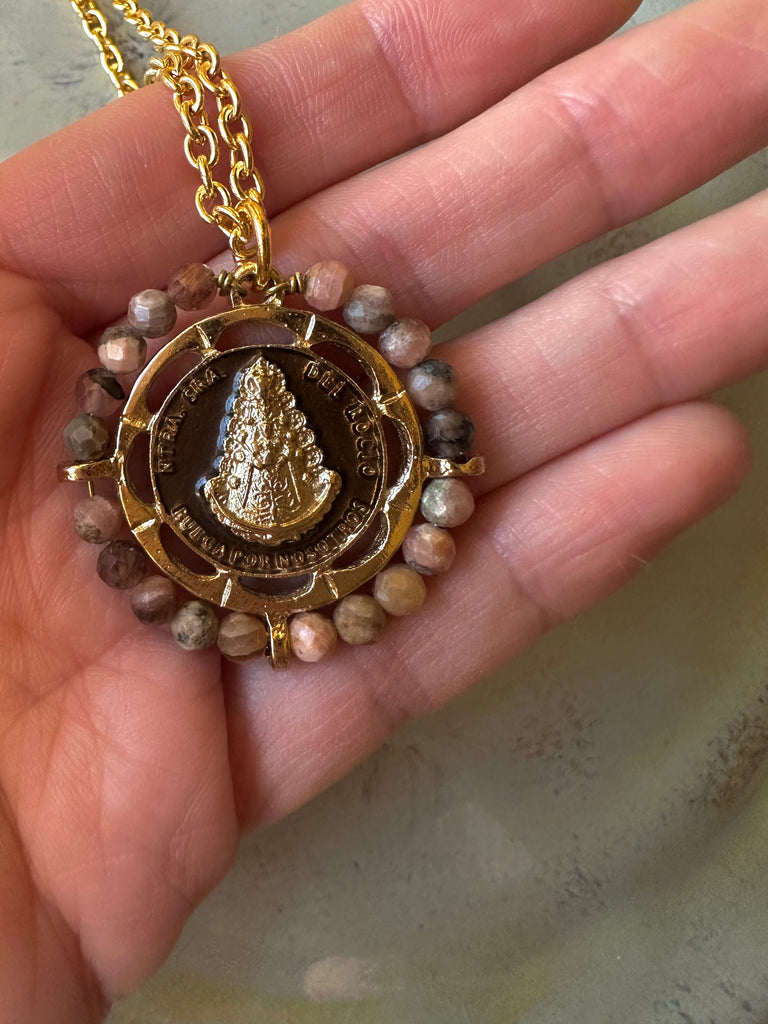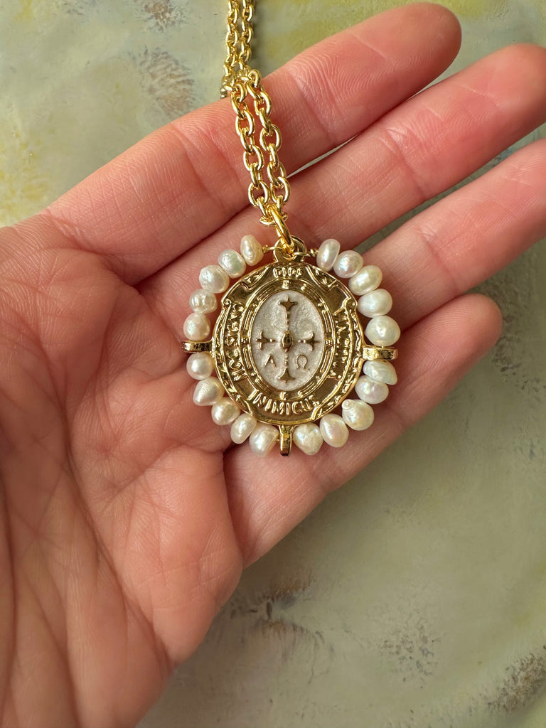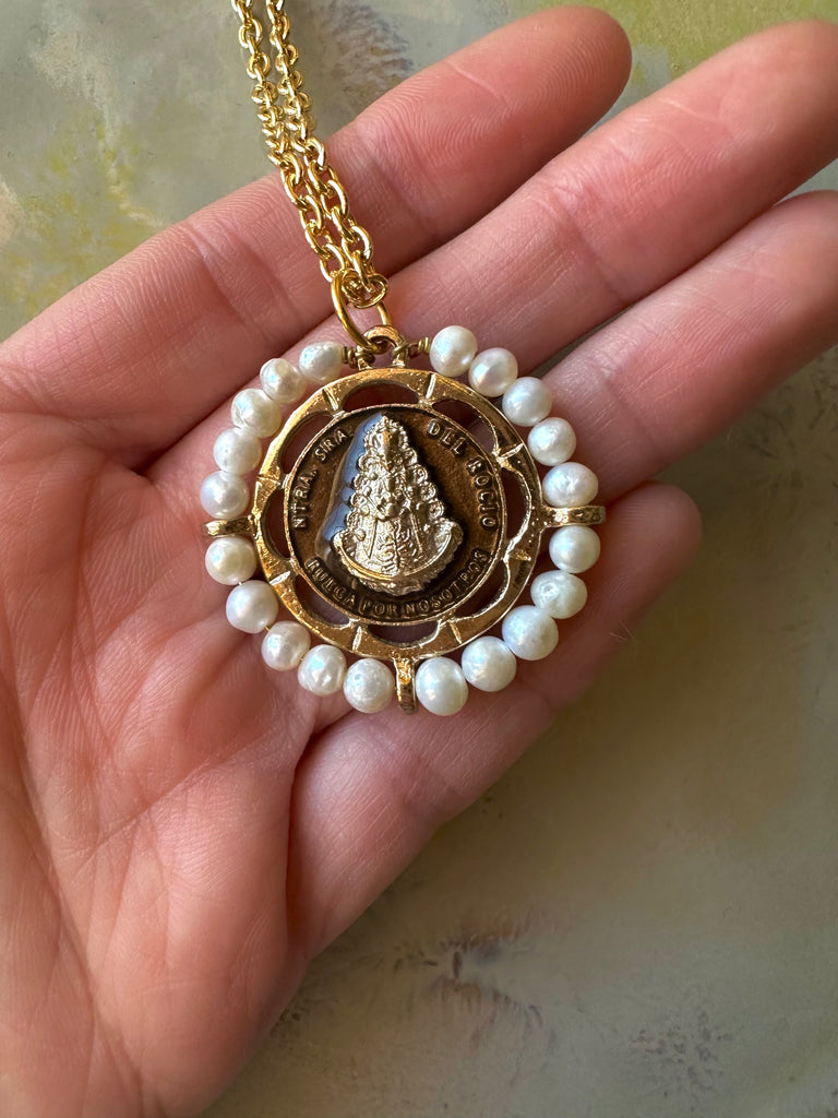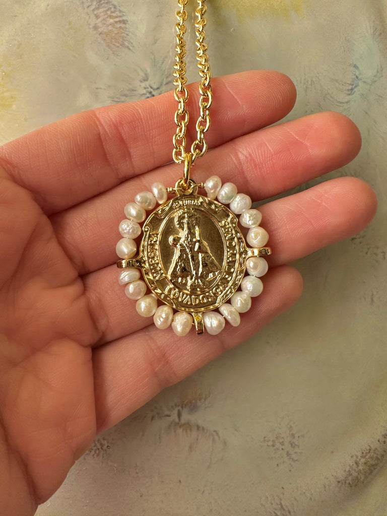 Medalla de la Virgen del Pilar con perla natural y esmalte blanco perla