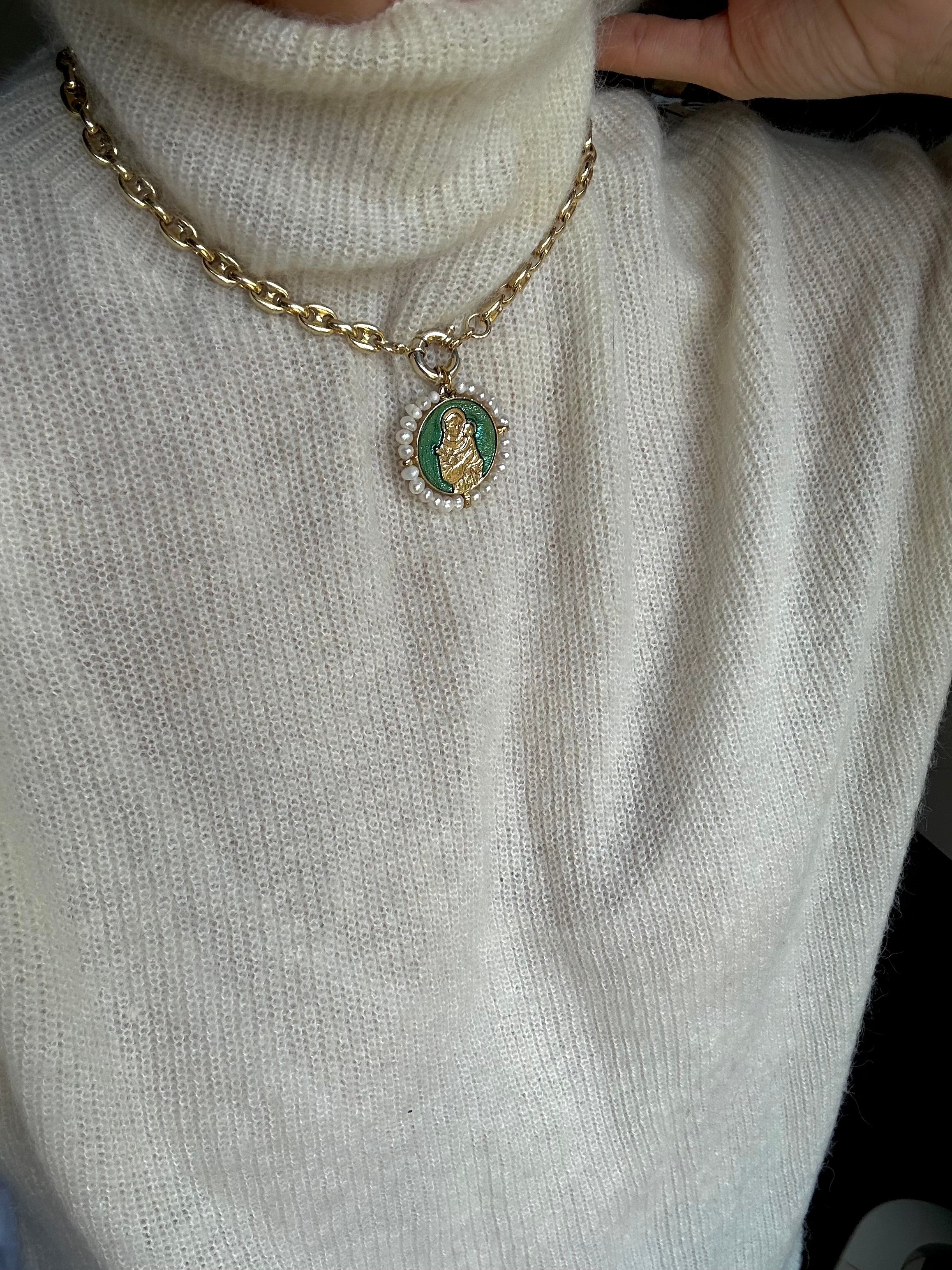 Medalla de San Antonio con perla y esmalte verde