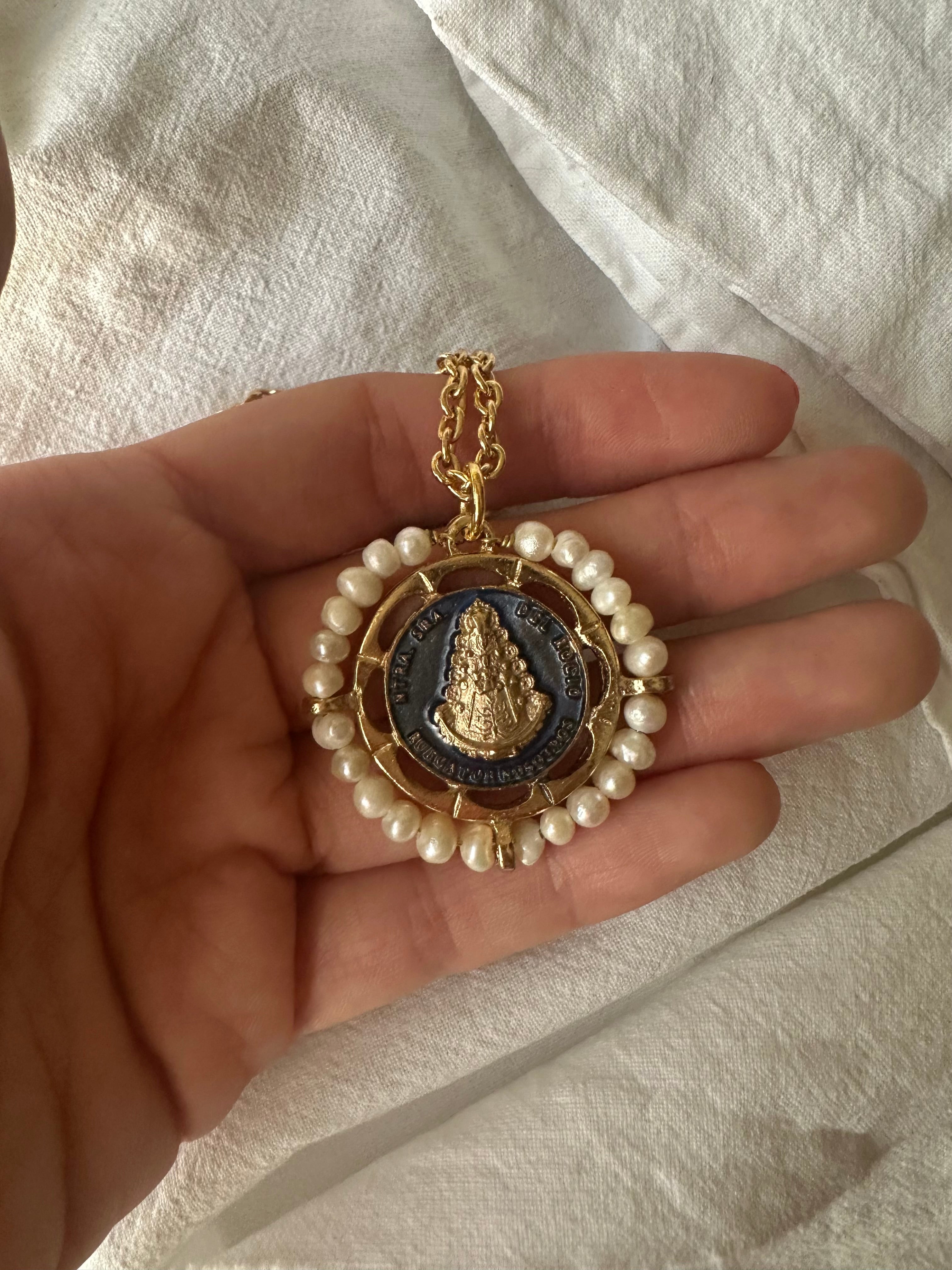 Medalla de la Virgen del Rocío con perla natural y esmalte azul marino