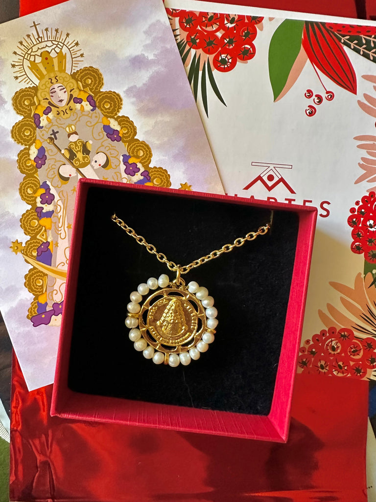 Medalla de la Virgen del Carmen con perla natural y esmalte azul marino