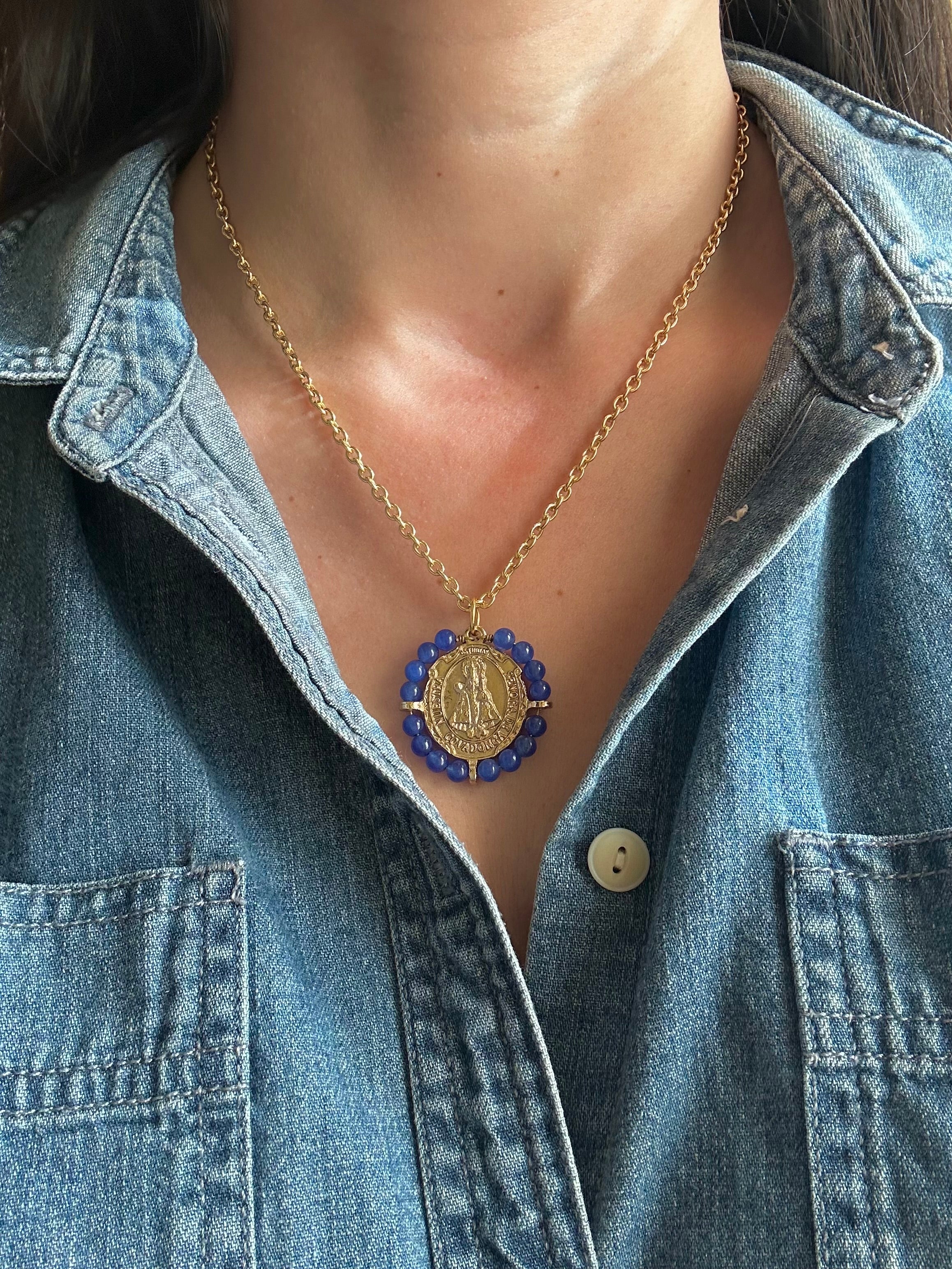 Medalla Virgen de Covadonga con piedras azul oscuro