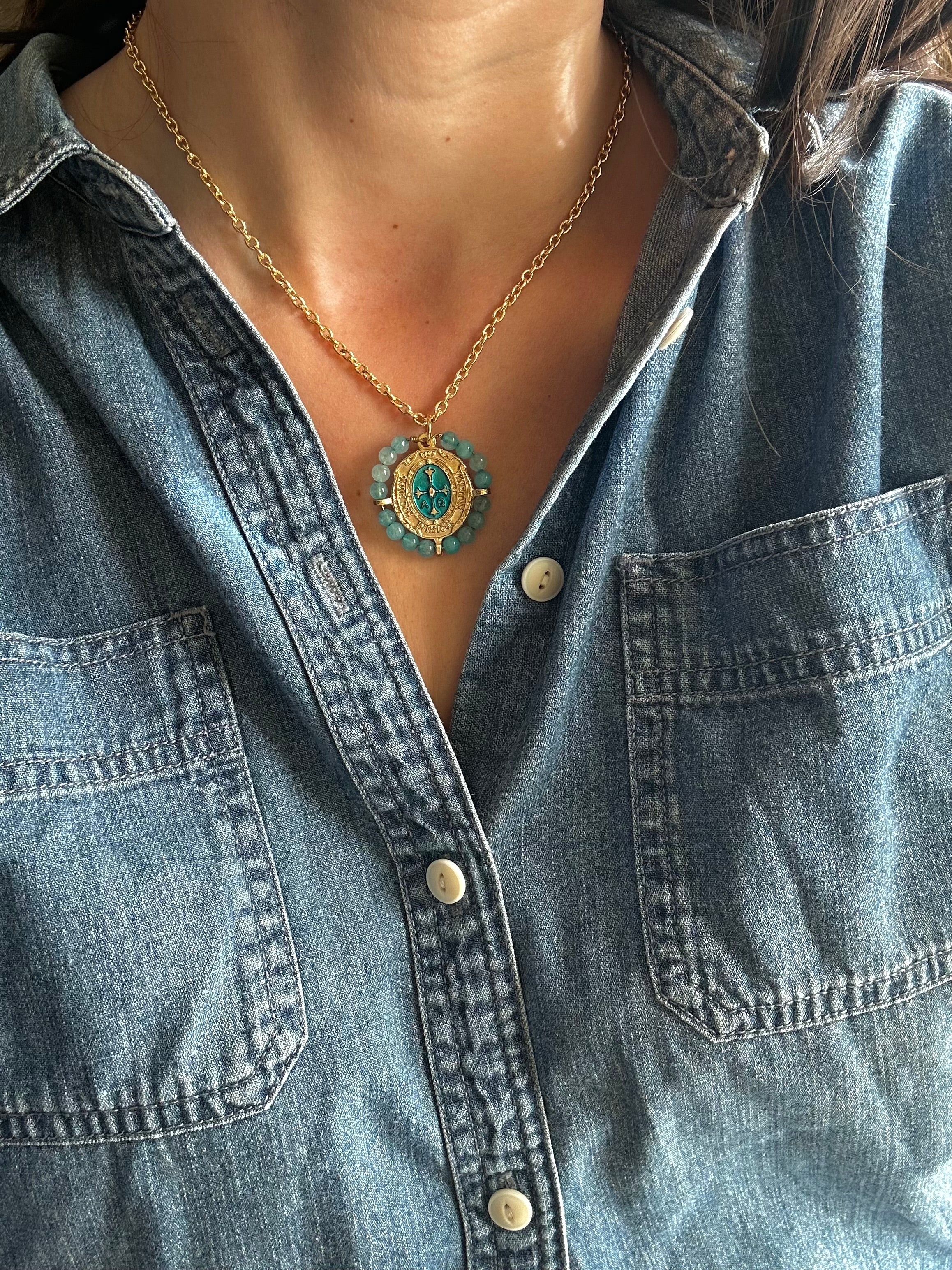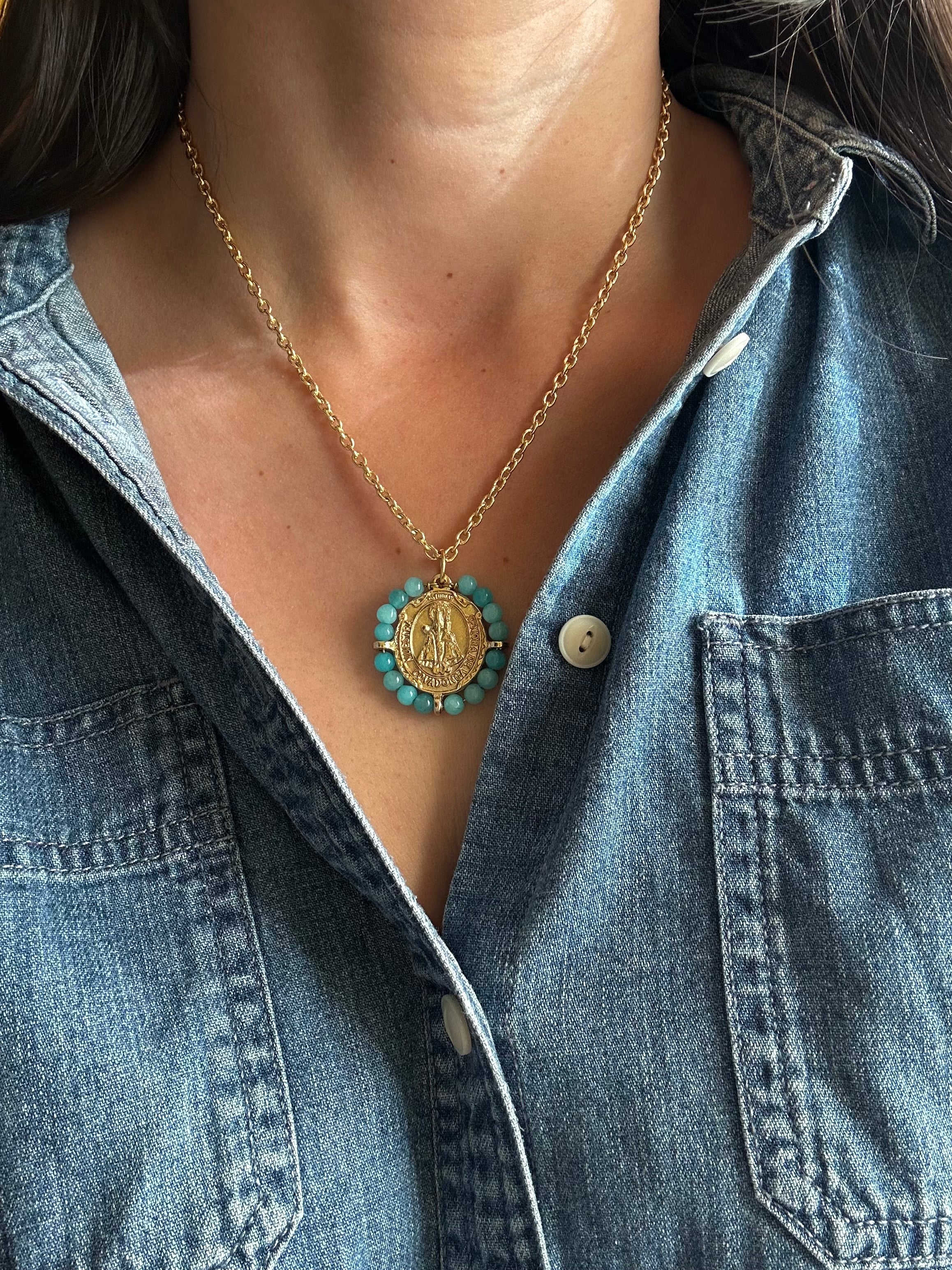 Nota: El Ojo de tigre es una piedra natural que puede presentar variaciones en su color y veteado, lo que hace que cada medalla sea única.
