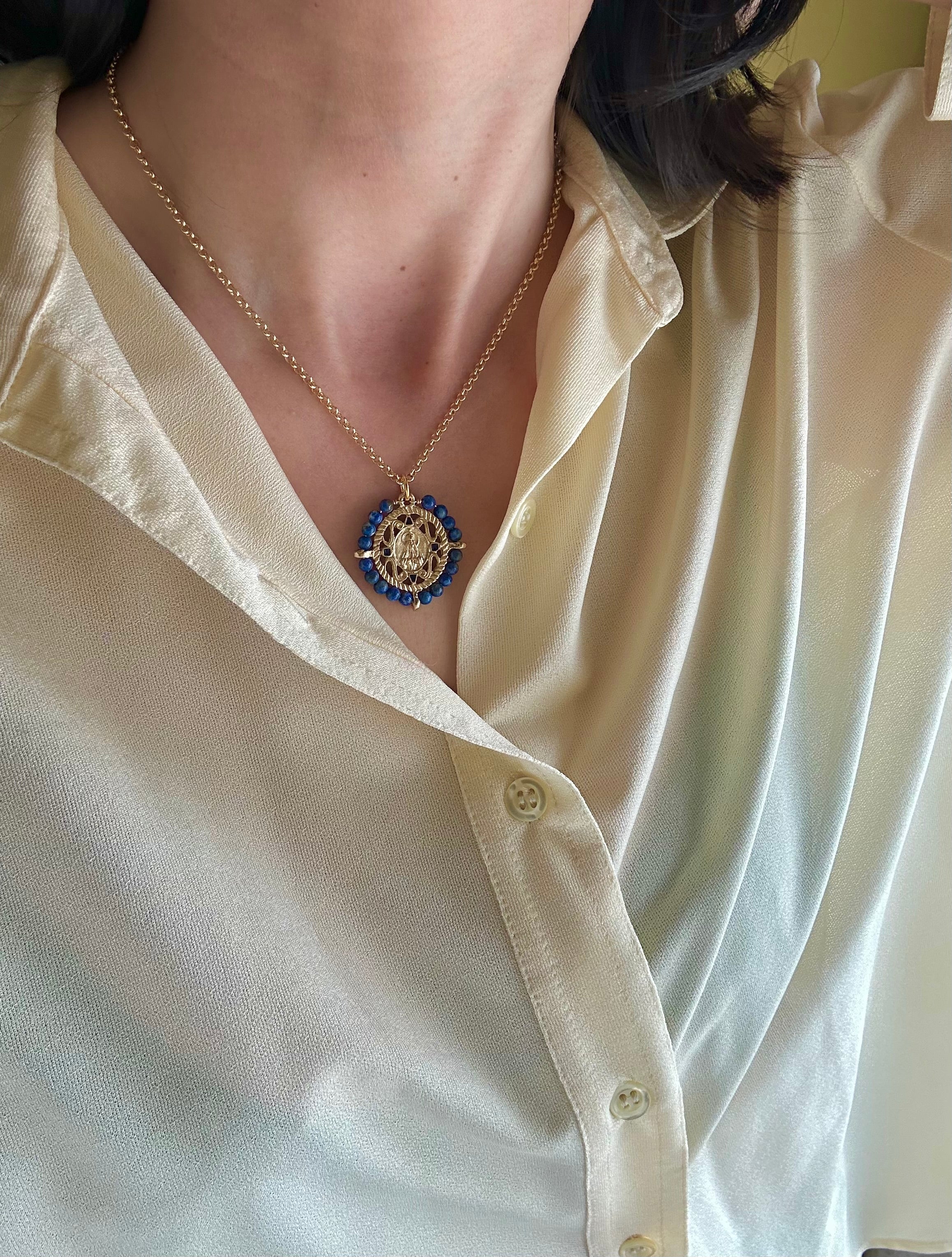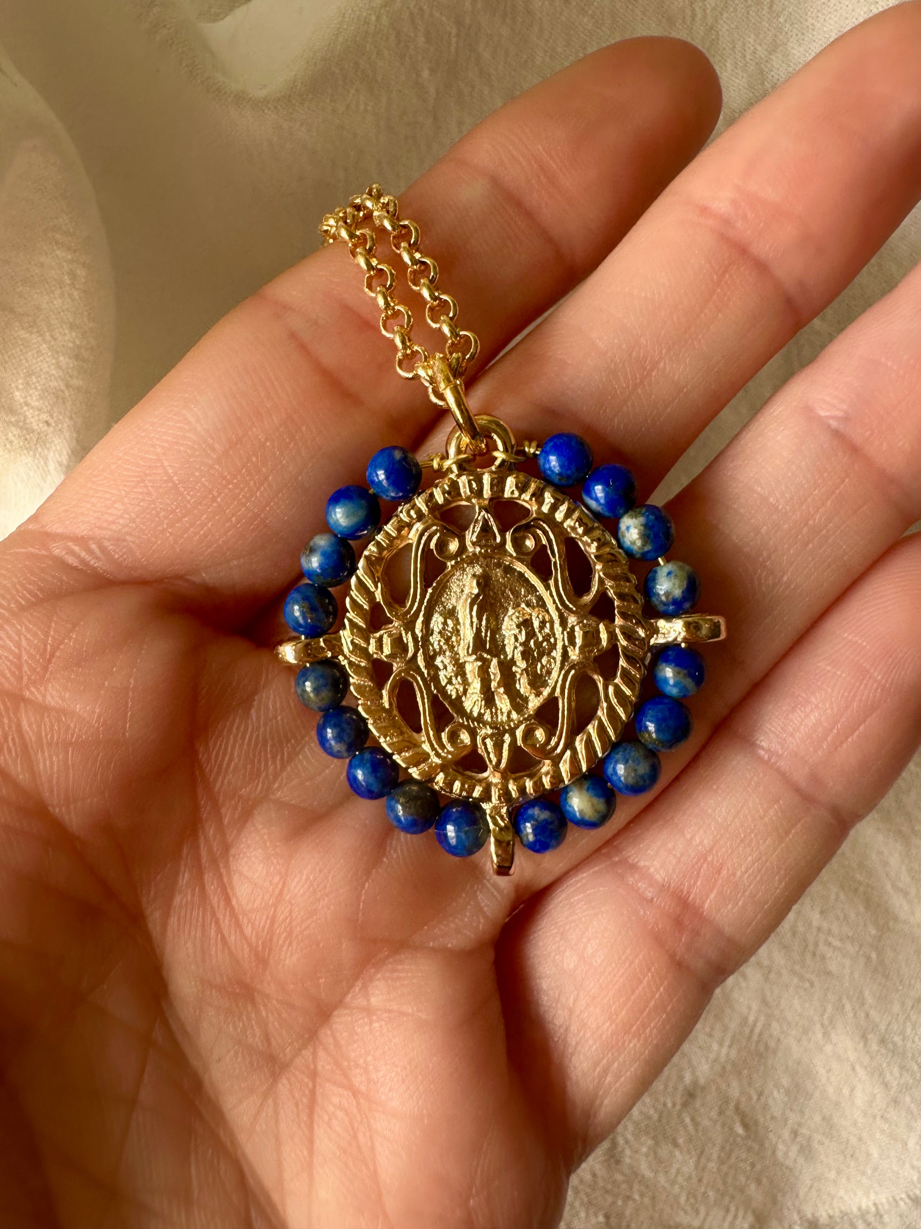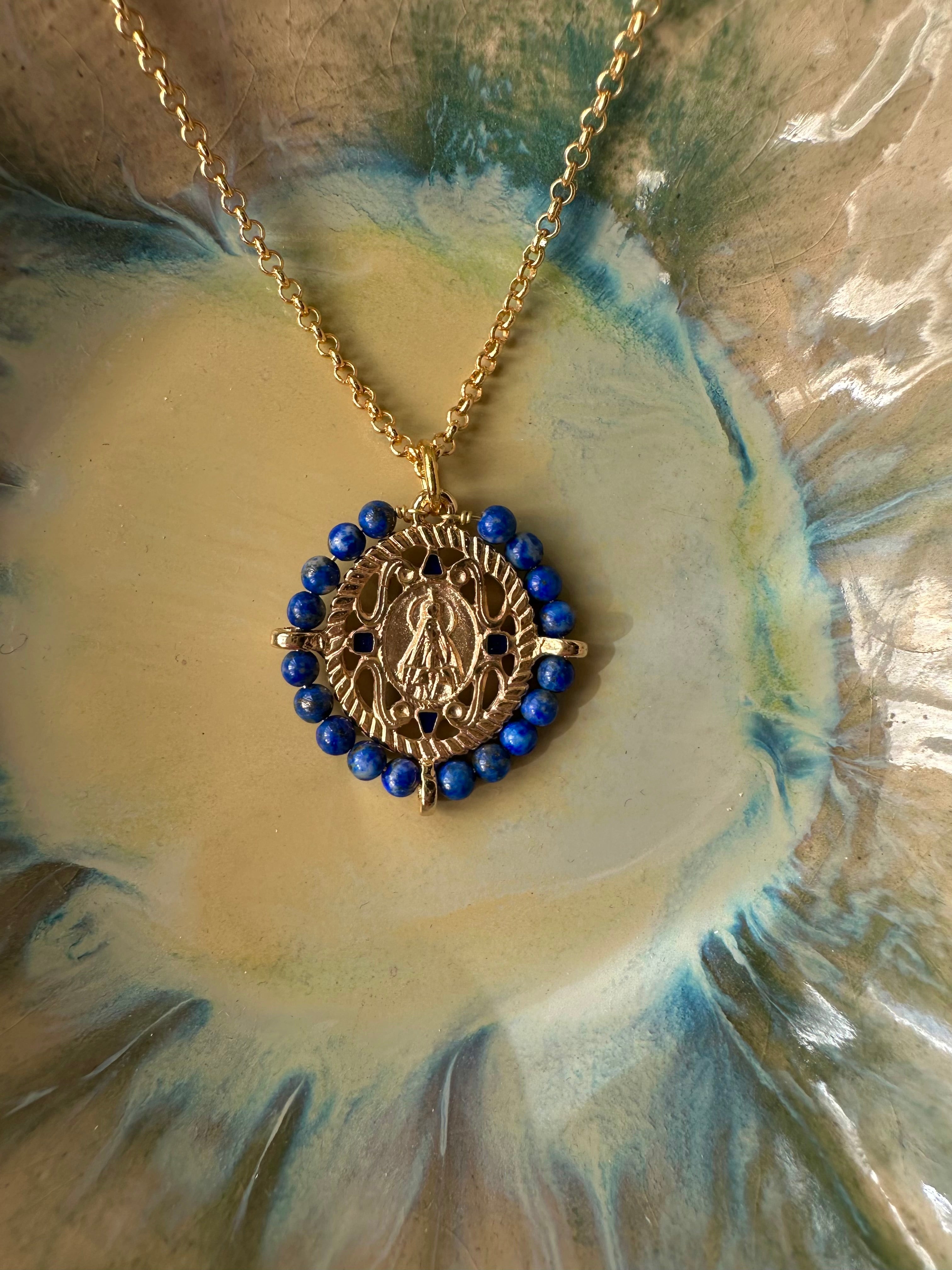 Medalla de la Virgen de Fátima con lapislázuli y esmalte azul marino