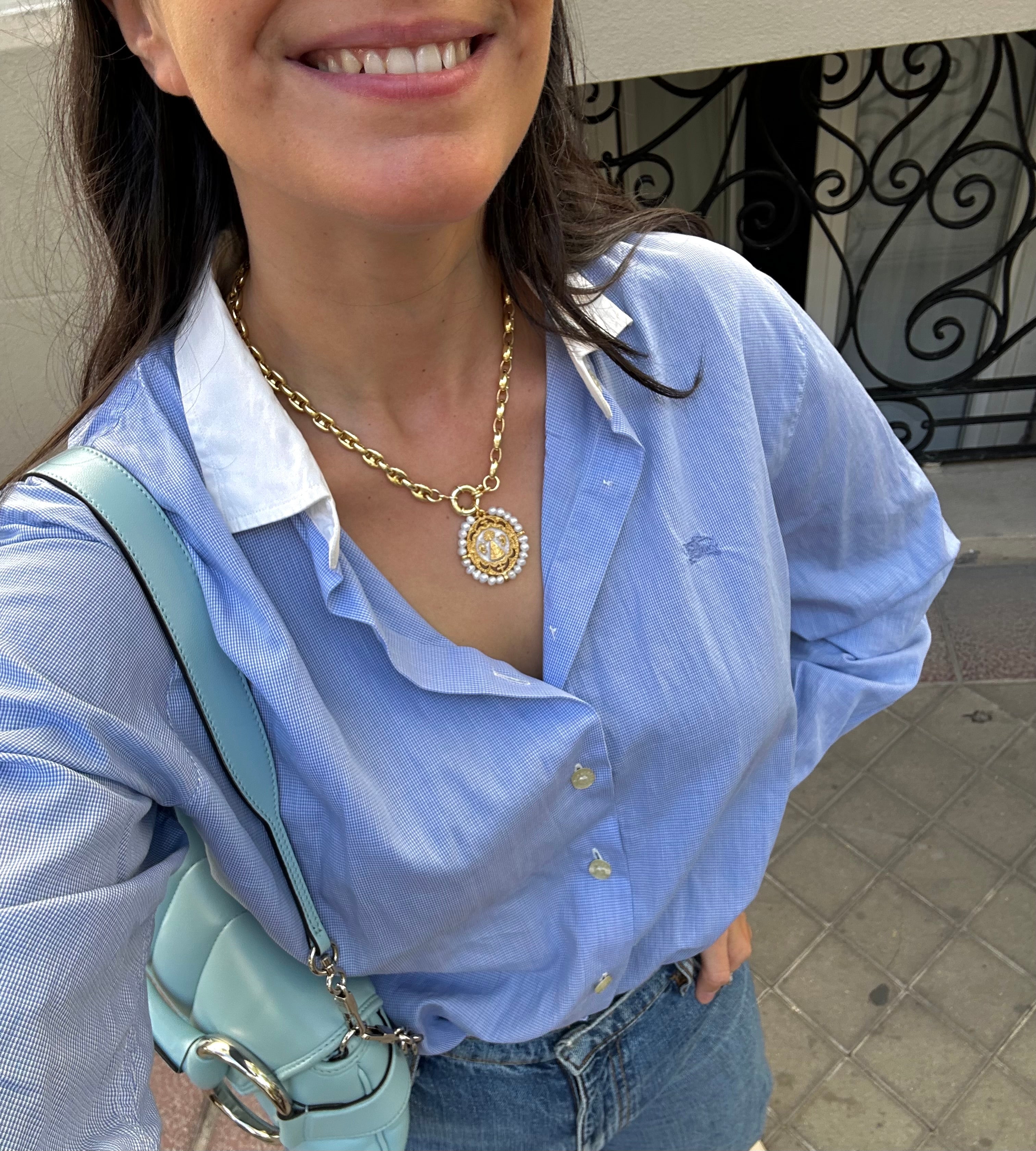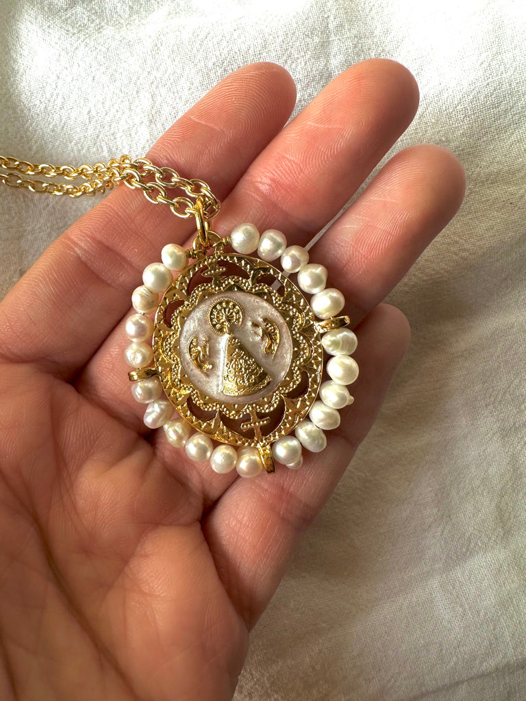 Medalla de la Virgen del Pilar con perla natural y esmalte blanco perla