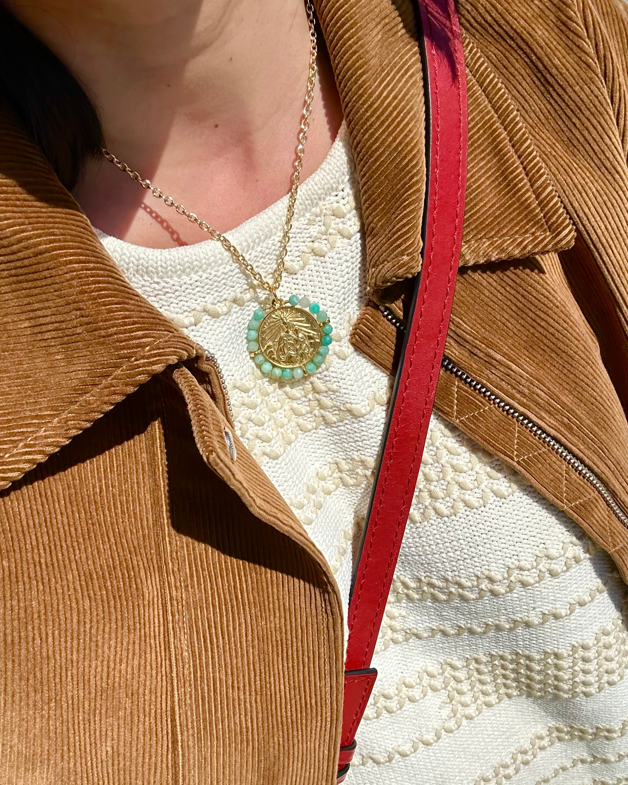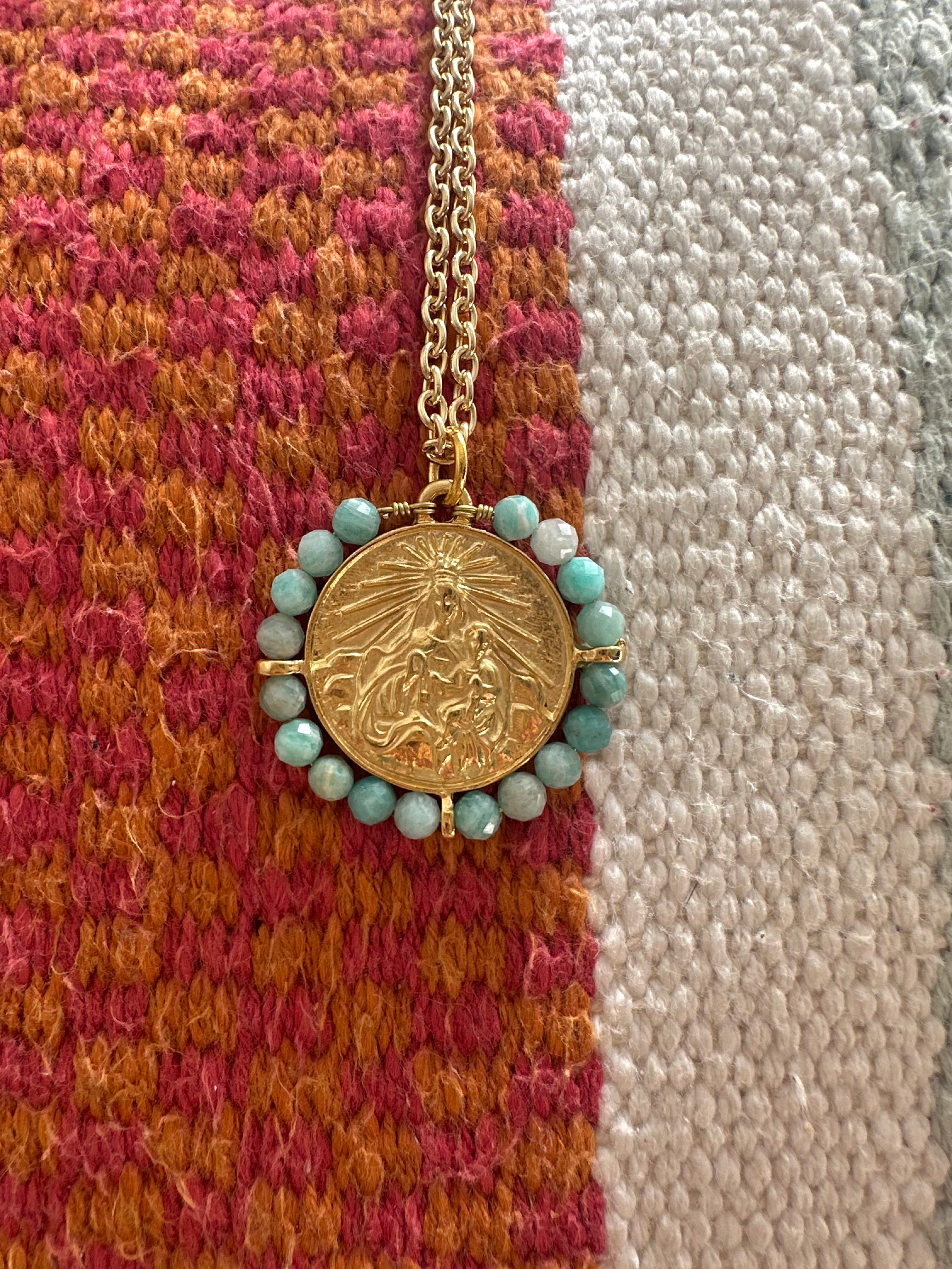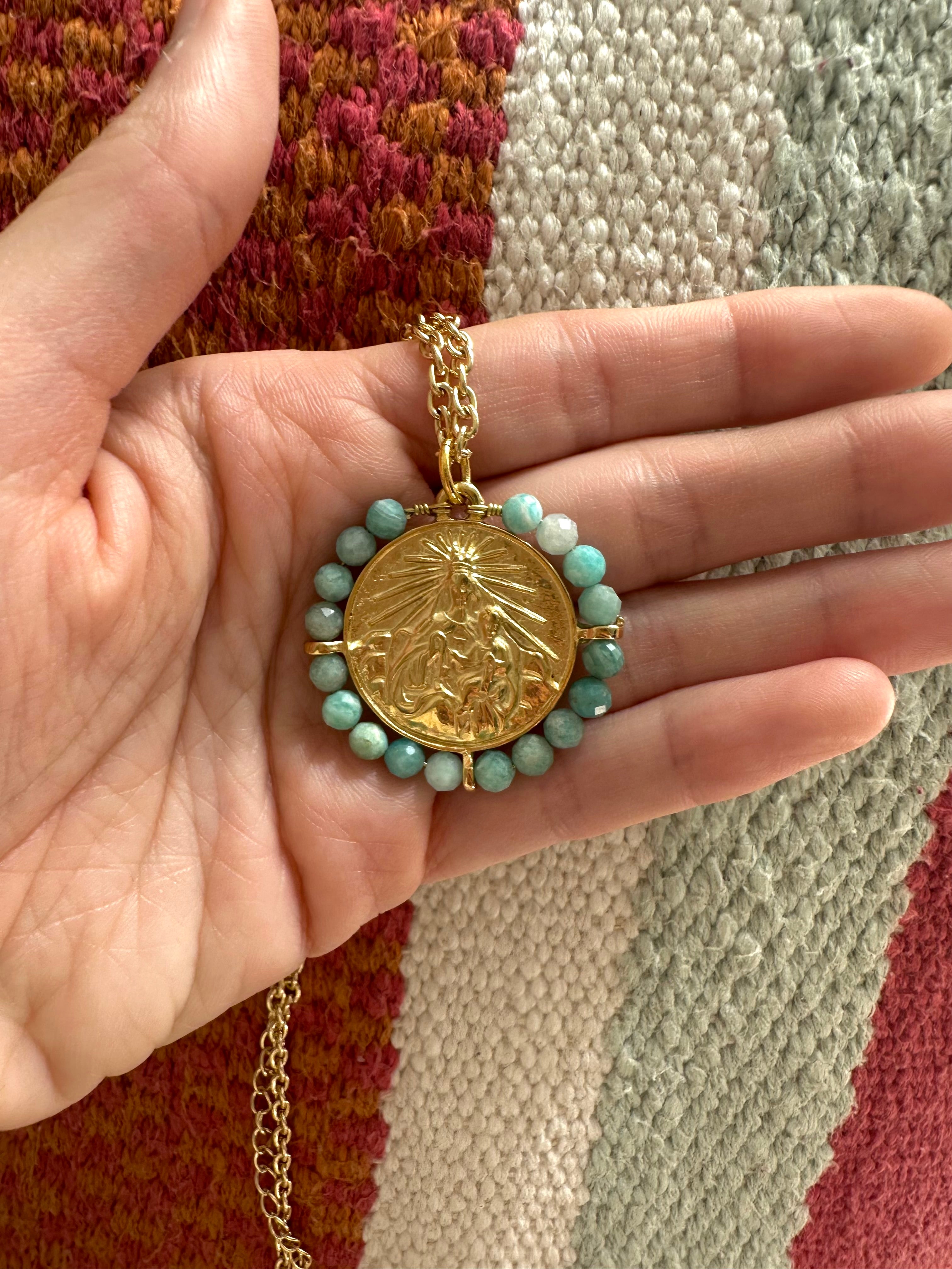 Zamak con baño de oro de 18K, lacado de protección y amazonita.
